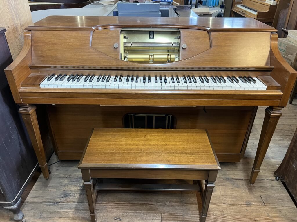 1980 Aeolian Musette Player 40” Console, Satin Walnut Finish with Automatic Rewind & Repeat. Electric or Manual Pedals. Regularly $1599, Now, only $1299.